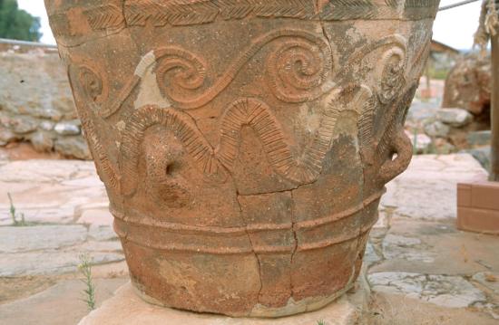 Utam során megálltam egy óriási pithosz előtt, és azon morfondíroztam, vajon mi lehetett ezekben az óriási agyagedényekben? Díszítésük egyszerű volt, úgy néztek ki, ahogy megtalálta őket Evans. Két nap múlva meglepődve láttam, hogy fiatal restaurátor fehérre festette az edények egy részét. Néhány nap múlva újból ellátogattam kedvenc edényeimhez, amik akkor már terrakotta színben ragyogtak. Úgy látszik a restaurátor ezzel a festési módszerrel konzerválták ezeket a csodálatos edényeket.