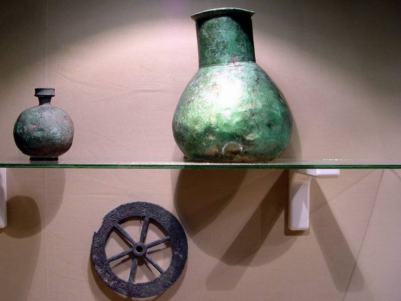 Bronzedények. A kerékre archaikus görög szöveget véstek.