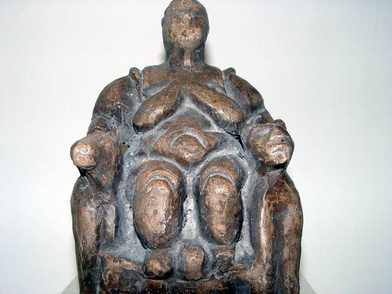 Elhízott asszony ül a trónuson (vagy éppen szül?), két oldalán leopárddal