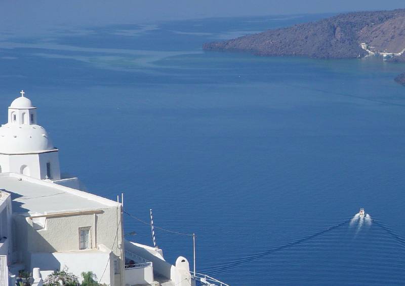 Reggel még nyugalom van, de amint megjelenik az első tengerjáró hajó a kalderában a