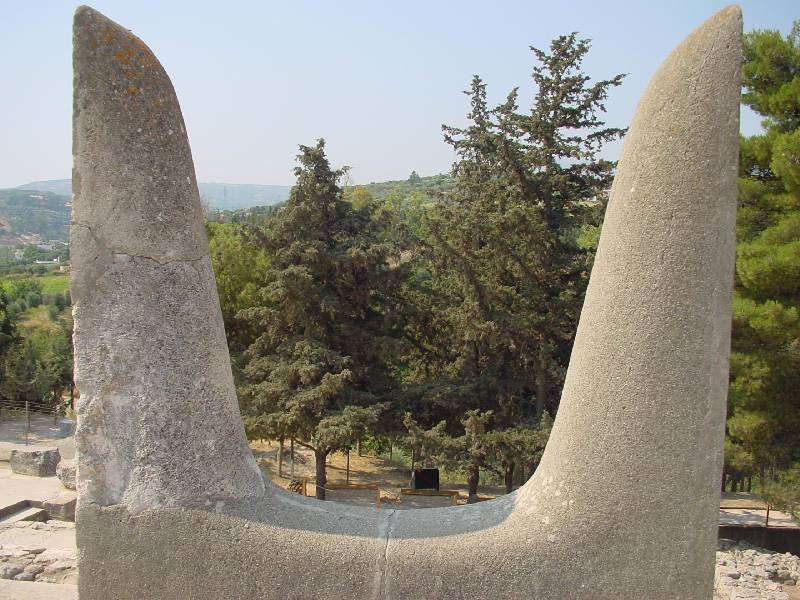 palota tetejét díszítették. Minósz király jelképe Knósszoszban többféleképp