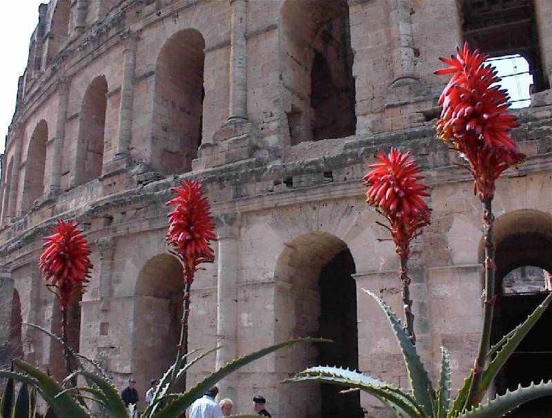 El-Dzsem amfiteátrum a kaktusz virágaival a sivatag szélén(Tunézia, sz)