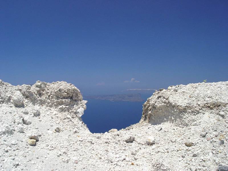 A fehér horzsakő mögött a Palea Kameni lapos kúpja látszik (Szantorini, sz)