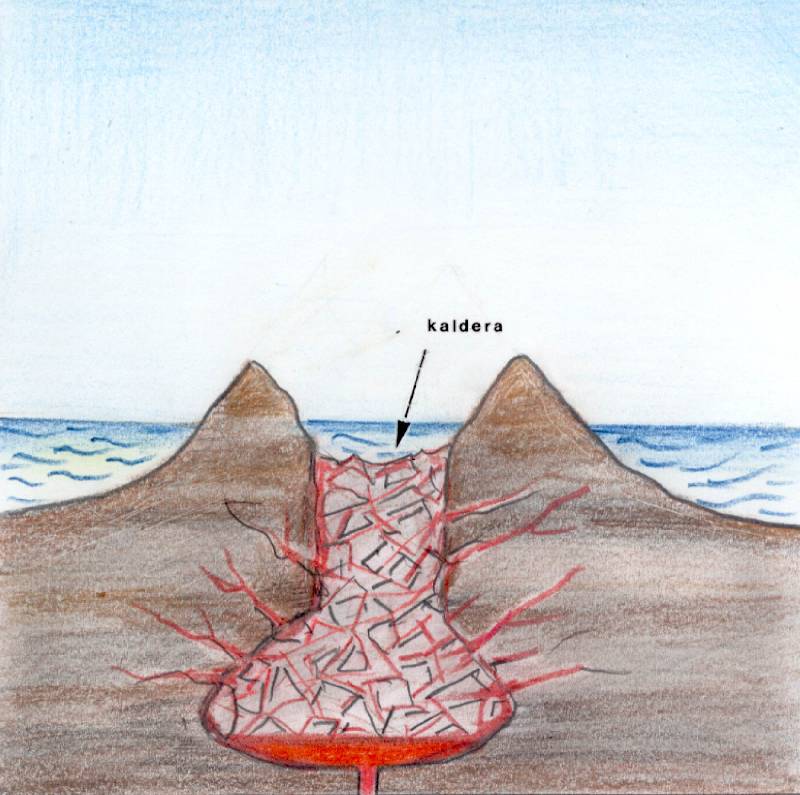 A negyedik fázis; a vulkáni hegy a beomlás következtében eltűnt a föld mélyében, és óriási
