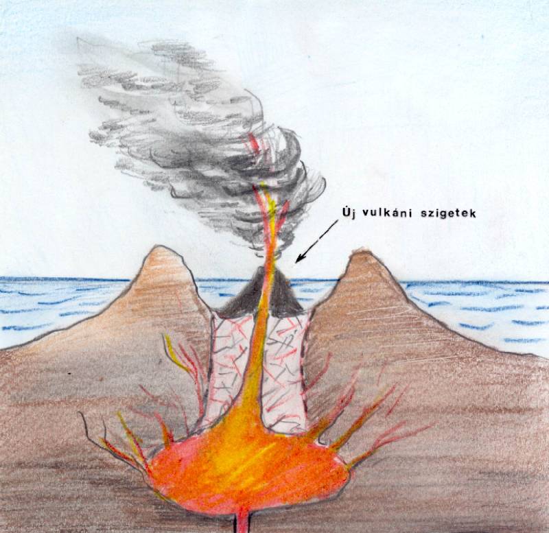 Az ötödik fázis (napjainkban!); az új vulkáni szigetek fokozatosan növekednek, s minden kezdődik elölről (NK)