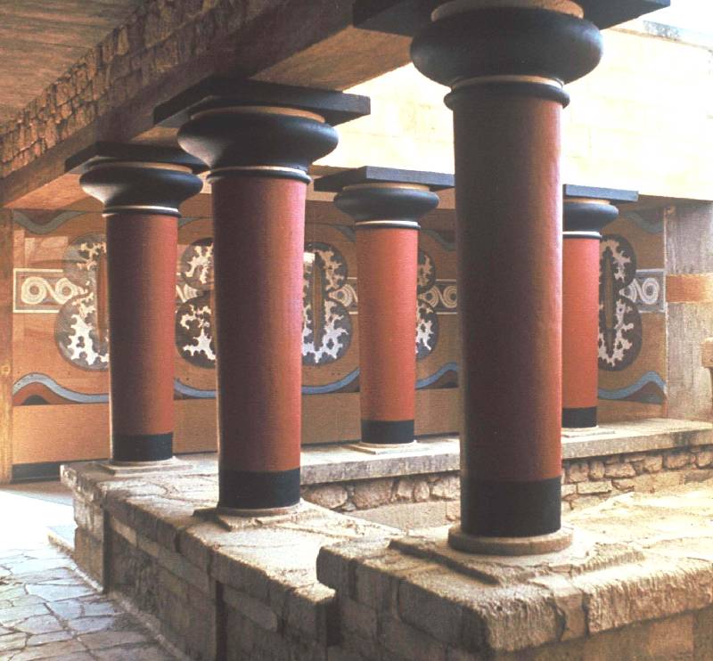A nyolcas alakú pajzsábrázolás a knósszoszi palotában az akháj időket idézi. A minószi freskókra utólag festették rá a pajzsokat. A kép elemzésekor Evans úgy vélekedett, hogy a királyi lakrészbe vezető utakat katonák őrizték. (Kréta, sz)