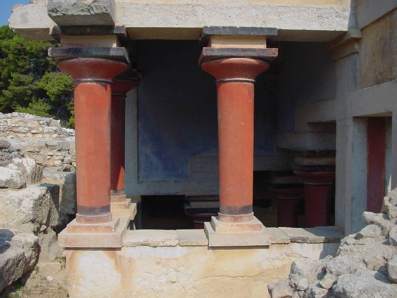Evans a palota piros oszlopait a feltáráskor előkerült eredeti freskók alapján rekonstruálta