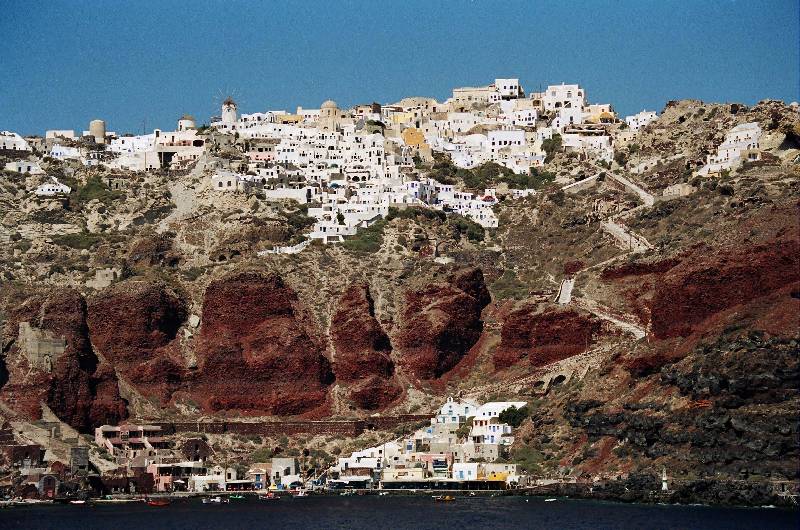 Oia a kaldera északi peremén épült. 1956-ban az épületek jelentős része egy földrengés következtében a kalderába csúszott. (Szantorini, sz)