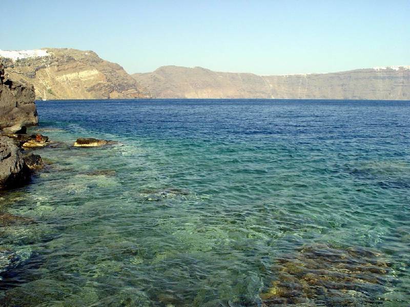 A Théra felrobbanása előtt a kaldera ezen a részén állhatott az a vulkáni kúp, amely beomlott a föld gyomrába és óriási változásokat idézett elő az emberiség történelmében (sz)