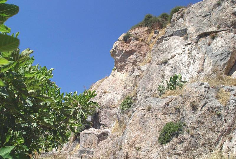 Évekig kerestem hiába! Végre „felfedeztem” a sziklába faragott ókori kígyót! Balra egy hellenisztikus szarkofág, jobbra sziklapárkányon látszik a kígyó. (Platinamosz hegy, sz)