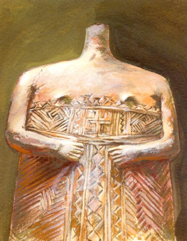 Trónuson ülő istennőt ábrázoló szobor egy része. Feje, lába letörött. A melle alól induló finoman bekarcolt minta a ruházatot utánozza. (Tisza-kultúra, Szegvár-Tűzköves, HTJM, a szerző fotója alapján rajzolta; CSBA, szöveg: Kalicz)