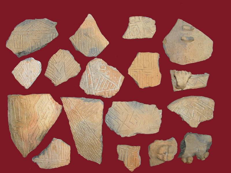 Edénytöredékek meander díszítéssel. Középen látható töredék egy arcos-edény része lehetett.