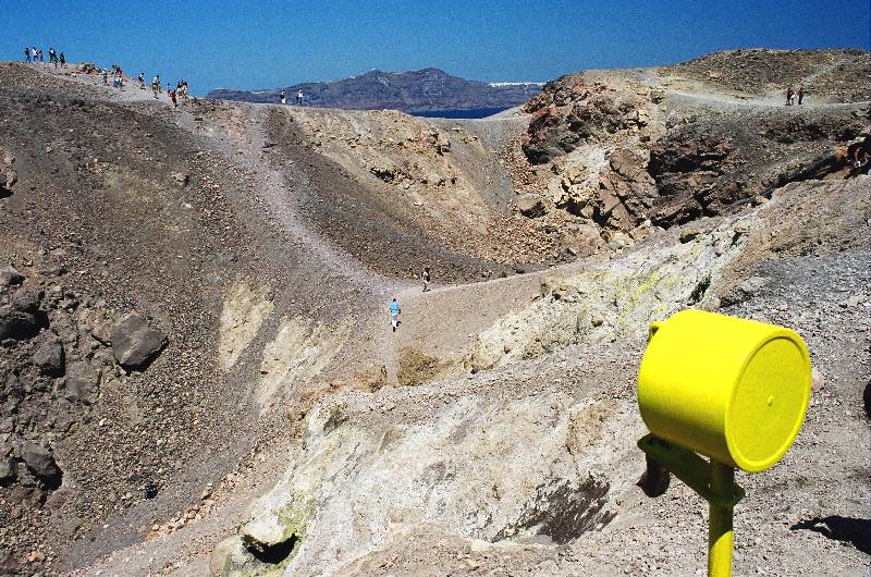 A földrengés-érzékelő rádiójeleit a világűrön keresztül regisztrálják a megfigyelő állomásokon. Távolban a kéntől sárgálló kürtők láthatók. (Szantorini, Nea Kameni, sz)