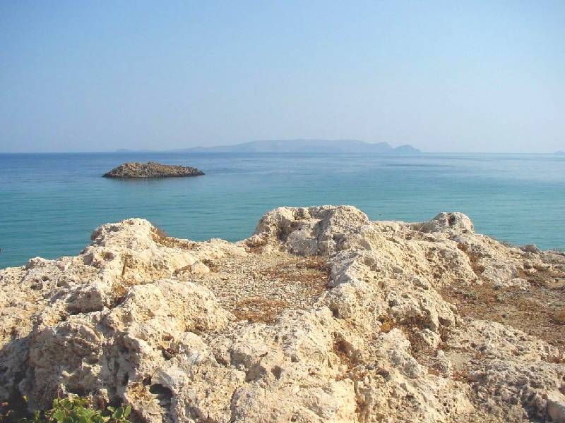 Amnisszoszi szentély lekopott maradványa a hegytetőn. Távolban Dia sziget