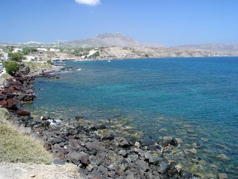 Az eltemetett Akrotiri a távolban húzódó partvonal alatt fekszik. A bronzkori partszakasz a kikötővel a tengerbe süllyedt. (Szantorini, sz)