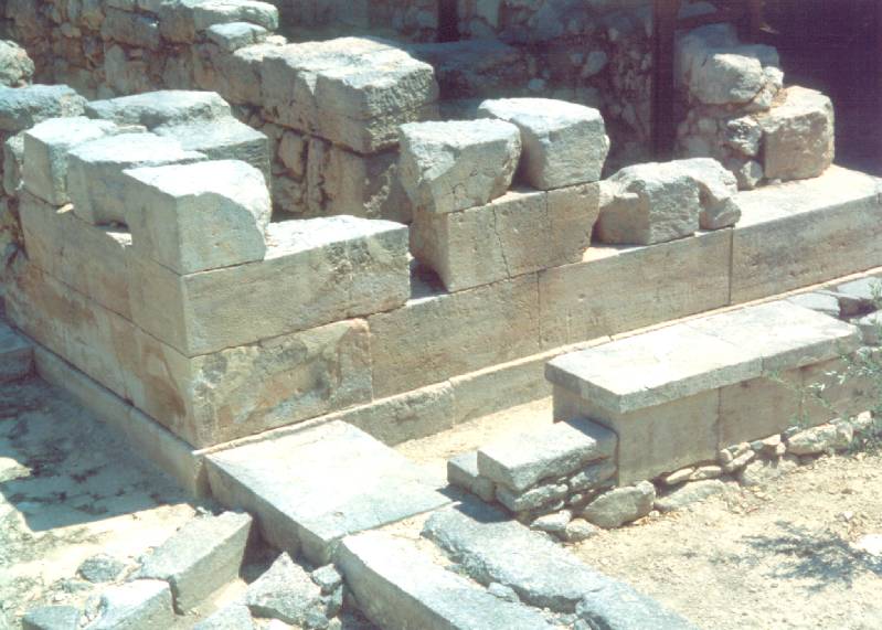 Archaneszi palota mívesen faragott kövei. Fala mellett kívülről csatorna vezet (Kréta, sz)