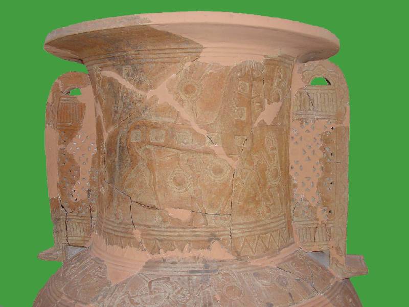 Az óriási amfora nyakán trójai falovat ábrázoló díszítés van. Az edény Kr. e. 7. század végéből származik. (Mykonosz, MRM, sz)