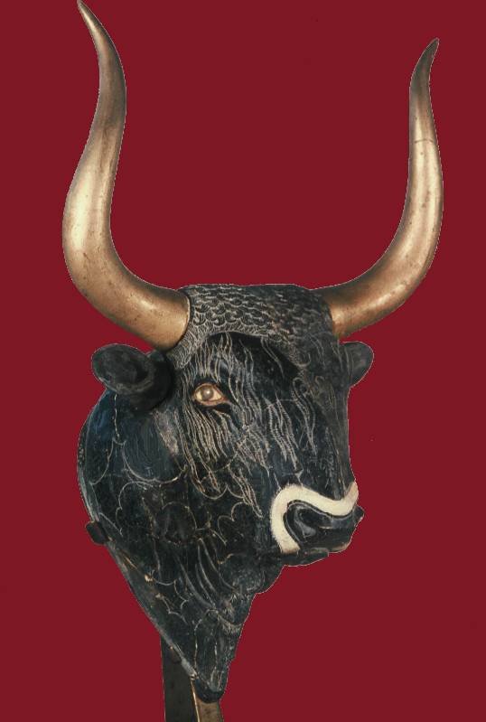 Fekete sztealitból (zsírkőből) készült bikafej. Egy italáldozati